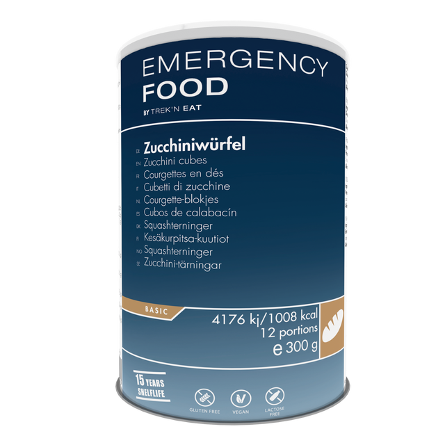 I cubetti di zucchine liofilizzate di Emergency Food sono ideali per zuppe di verdure, stufati o insalate. Basta cuocere come verdure fresche per 5 minuti e tutto il sapore delle zucchine può essere elaborato.