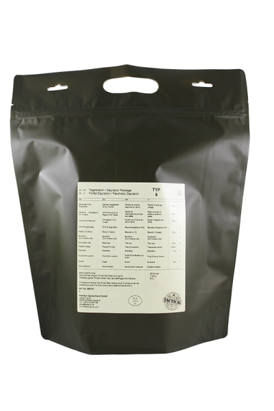 Il “Day Ration Pack” è un pacchetto pasto composto individualmente per una persona per 1 giorno. Garantisce l'approvvigionamento qualora non sia possibile fornire il cibo dalla cucina da campo o dalla mensa. La base dei pacchetti è il nostro portfolio Trek’n Eat con pasti liofilizzati. La liofilizzazione rimuove completamente il contenuto di acqua dagli alimenti Trek'n Eat senza distruggere importanti vitamine e minerali. Trek'n Eat soddisfa quindi i requisiti per un'alimentazione ottimale anche in condizioni estreme. I “Day Ration Packs” vengono integrati con alimenti accuratamente selezionati come bevande, barrette, snack, ecc.