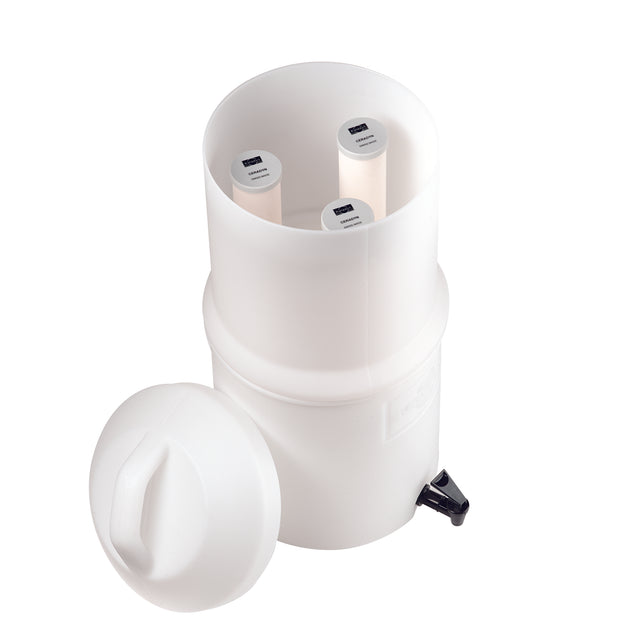 - Filtro a gravità per grandi quantità di acqua con contenitore di stoccaggio da 10 litri.
